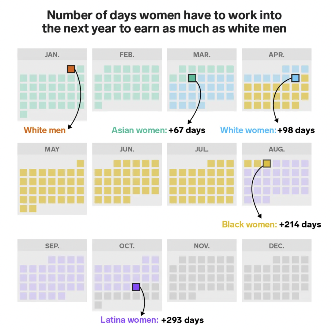 Women who were full-time, year-round employees made 82.3 cents for every dollar men made in 2019, based on median earning data from the Census Current Population Survey. That means women are paid 17.7% less than men, earning $10,157 less than men. Black and Hispanic women are most affected by the wage gap, especially when compared to non-Hispanic white men, who make up the largest demographic segment of the workforce (Source: Business Insider).